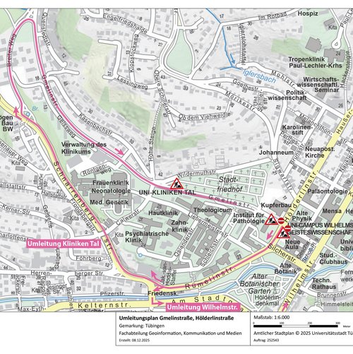 Alle Verkehrsteilnehmenden mit dem Ziel Uni-Kliniken Tal (Frauenklinik, Hautklinik, Zahnklinik und Klinik für Psychiatrie), die aus Richtung Innenstadt kommen, können über die Rümelinstraße, Schnarrenbergstraße und Breiter Weg ausweichen, um von Norden in die Gmelinstraße einzufahren. Vom Lustnauer Tor (Wilhelmstraße) kommend, kann auch die erste Abbiegung durch die Silcherstraße in Richtung Rümelinstraße/Schnarrenbergstraße/Nordring genutzt werden. Der Verkehr aus Richtung Lustnau wählt am besten bereits beim Pauline-Krone-Heim die Route über den Nordring.