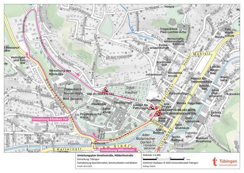 Von stadtauswärts (Lustnau) kommend ist in der Hölderlinstraße die Abbiegespur nach rechts in die Gmelinstraße (Richtung Kliniken) gesperrt. Die Zufahrt ist bis zum Stadtfriedhof und maximal bis zur Islamischen Theologie noch möglich. Aus Richtung Norden/WHO kommend, kann aus der Gmelinstraße nur noch nach rechts in die Hölderlinstraße abgebogen werden. Die Weiterfahrt geradeaus weiter auf der Gmelinstraße in Richtung Wilhelmstraße ist nicht möglich.