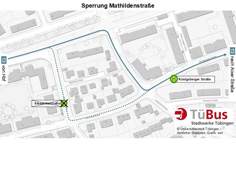 Die Mathildenstraße wird bis vrs. 24.10.2025 für den Busverkehr gesperrt. Die Haltestelle Alexanderstraße kann nicht bedient werden.