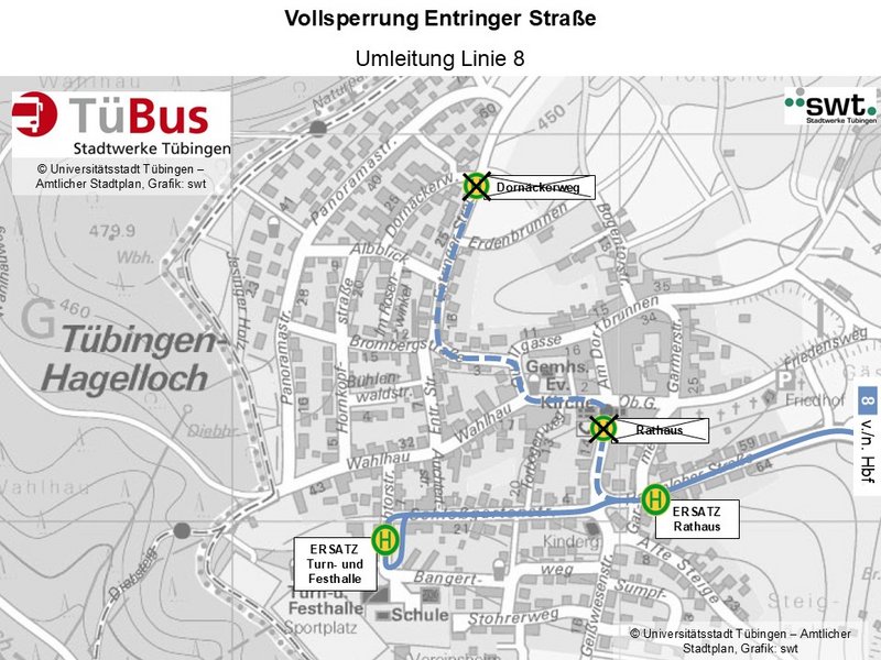 Linie 8 wird zur Turn- und Festhalle umgeleitet. Die Haltestellen Rathaus und Dornäckerweg können nicht bedient werden. Stattdessen werden die Ersatz-Haltestellen Rathaus und Turn- und Festhalle bedient.
