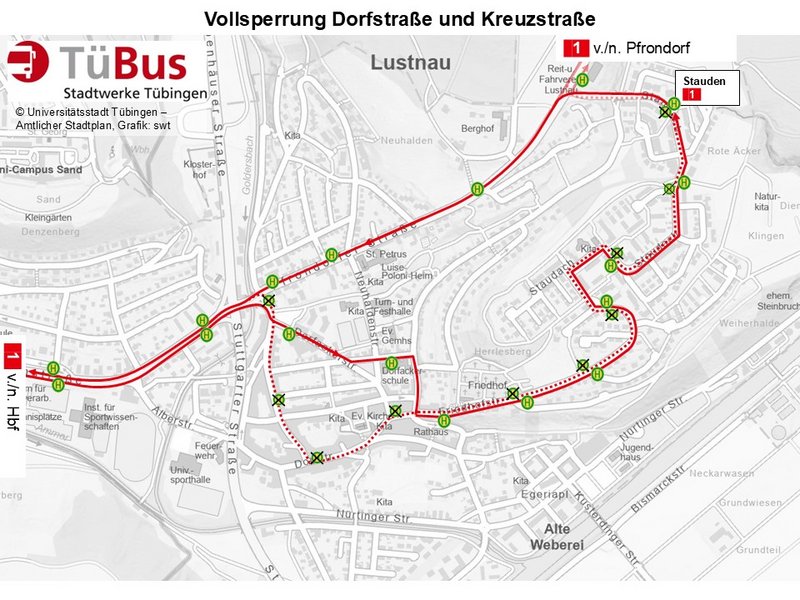 Die Haltestellen zwischen Stauden und Kreuzstraße können stadteinwärts nicht bedient werden. Bitte nutzen Sie die Stadtauswärtsfahrt oder die zusätzlich bedienten Haltestellen Eichhaldenstraße, Neuhaldenstraße und Jürgensenstraße.