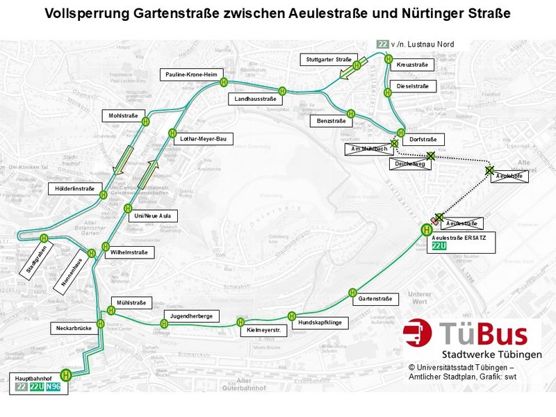 Weiterhin verkehrt eine zusätzliche Umleitungslinie 22U zwischen den Haltestellen Hauptbahnhof und Aeulestraße. Haltestelle Aeulestraße wird dabei an Ersatz-Haltestellen bedient.