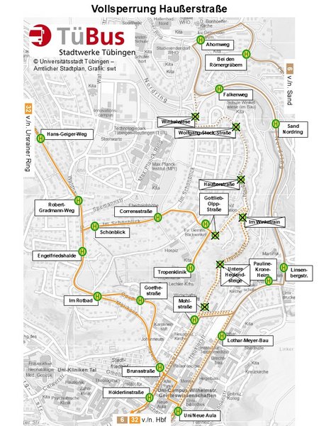 Linie 32 wird über Sigwartstraße – Goethestraße / Mörikestraße – Waldhäußer Straße umgeleitet und bedient den Abschnitt Schönblick – Tropenklinik in beiden Richtungen als Stichfahrt. Die Haltestellen Lothar-Meyer-Bau, Mohlstraße, Untere Heulandsteige, Im Winkelrain und Gottlieb-Olpp-Straße stadteinwärts können nicht bedient werden. Die HaltestellenBrunsstraße, Goethestraße, Im Rotbad und Engelfriedshalde werden zusätzlich bedient.